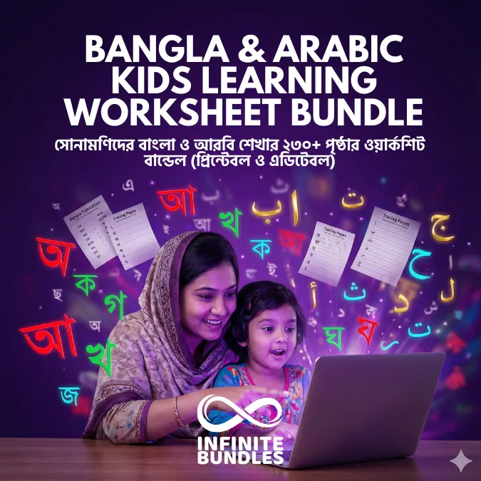 ✅ What’s Inside: 200+ Bangla Learning Pages & 30+ Arabic Alphabet Tracing/Activity Sheets. ⚠️ Pro Tip: বাংলা ফাইলগুলো এডিটিং এবং ইন্সপিরেশনের জন্য সেরা। রিসেল করার আগে ওয়াটারমার্ক রিমুভ বা এডিট করে নিজের ব্র্যান্ডিং করার পরামর্শ দেওয়া হলো। Pay Once, Sell Forever: কোনো হিডেন চার্জ নেই। ৯৯ টাকায় কিনে আনলিমিটেড বার রিসেল করুন (১৪৯-২৯৯ টাকায়)।